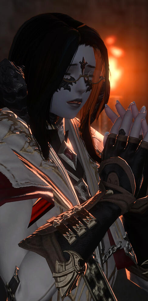 How a xaela came to be a woman of the cloth is a long story, and one quite a few residents of Ishgard are already familiar with. In brief: Sister Fortuna was saved from certain death by a Halonic missionary on a trip to the Azim Steppe. She dedicated her life to Halone, despite the inherent misfortune of her birth. She lived and breathed scripture for over twenty years, knowing all of her suffering was just and right, and then she found out it had all been based on a lie.This shattered her faith broke her inside was quite disappointing. Fortuna officially cut ties with the Ishgardian Orthodox Church after the restoration of the Firmament was completed. She opened an almshouse, where she welcomes those in need of a hot meal or a temporary place to stay—with no questions asked, but a kind shoulder to lean on if one should want to talk.Fortuna insists upon seeing the good in people, no matter who they are or what they've done. If the clergy could see the company she keeps now—hardened criminals, users of forbidden magic, thieves and perverts and assassins—they'd faint. But the miscreants she surrounds herself with make her feel more at home than the church ever did. It's not that she's gullible, even if a life spent inside the Holy See left her sheltered; it's that she wants to give everyone an opportunity to be good. Sometimes her trust is misplaced, but she'll always give people the chance to be better. And maybe she likes the danger. And maybe if she gets hurt, she deserves it.There's a soft care in everything she does, and she leaves nothing to half-measures. She's an excellent listener, good at making others feel comfortable, but she'd sooner swallow her own tongue than open up about herself to anyone else. The further away she gets from the church, the more her hidden mischievous streak emerges, mostly in the form of good-natured teasing. Anyone who manages to push past her quiet exterior knows there's a fiery, passionate woman beneath; reduced to embers by Ishgard's snow, but not yet extinguished.